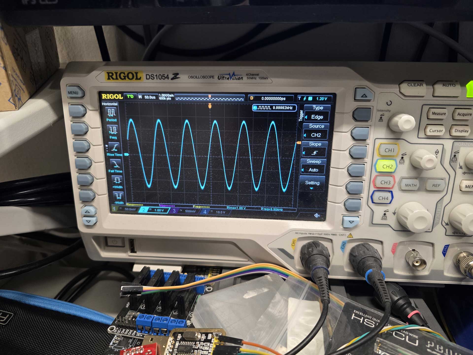 When the test project was built, I hooked up an Amanero as I2S source and an ES9023-based tiny DAC as an I2S receiver. I connected the analog out of the DAC to my oscilloscope and uploaded the code to the FPGA. I played a test file consisting of a 10KHz sine wave and got.. junk on the oscilloscope.